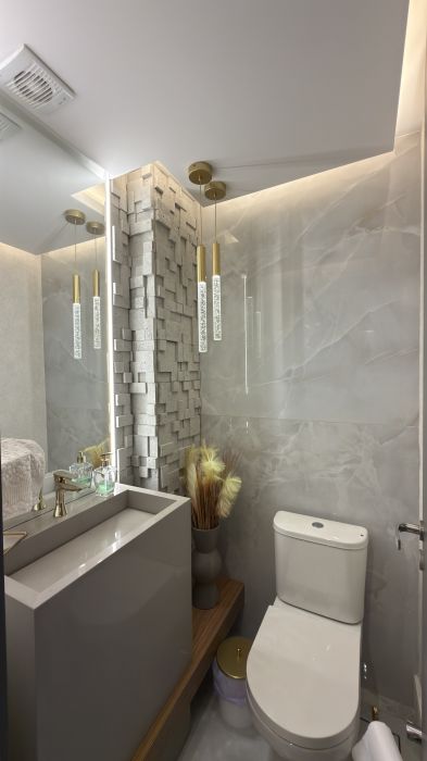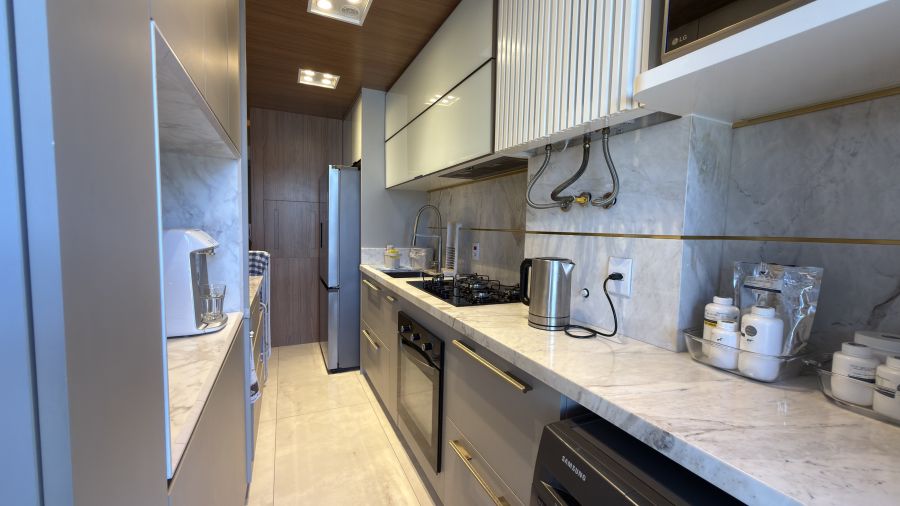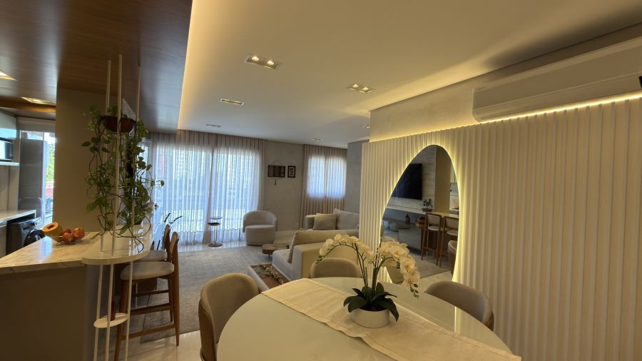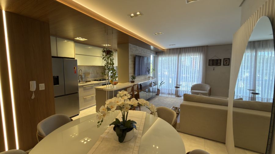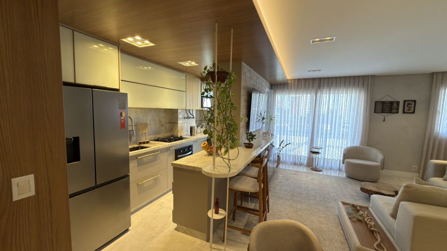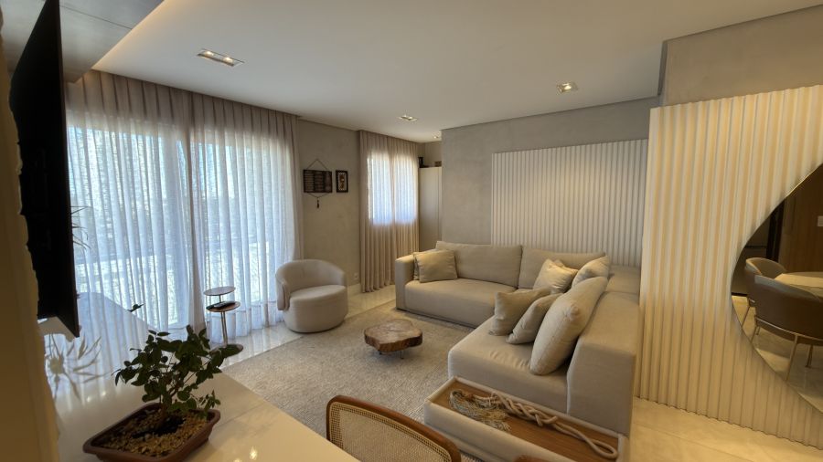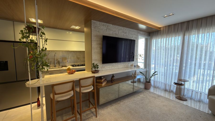 Com uma área privativa de 83m², o imóvel se destaca por ser entregue totalmente mobiliado e decorado, apresentando um projeto de interiores que prioriza a harmonia visual e o aproveitamento inteligente de cada espaço. A atmosfera é de acolhimento imediato: ao entrar, percebe-se o cuidado nos acabamentos e a qualidade dos materiais escolhidos, criando um cenário pronto para ser habitado.